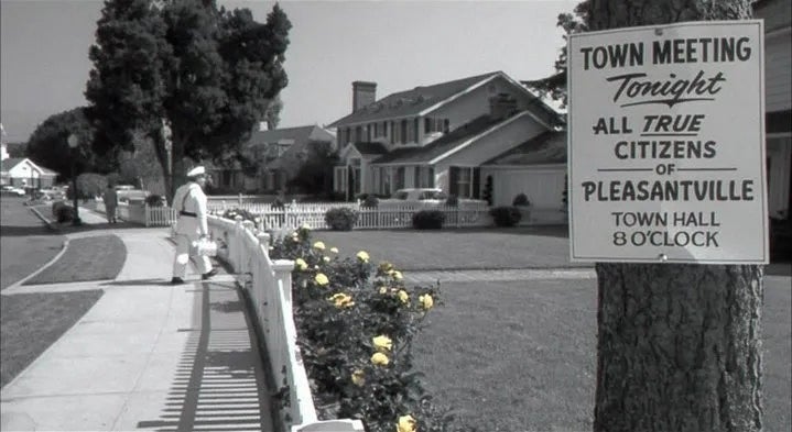 Faussement simpliste, pleinement atypique, Pleasantville laboure à contre-sens du tutélaire “c’était mieux avant”. Il y a cette scène évocatrice où, lors de son premier jour de lycée dans le décor de la sitcom, Jennifer/Mary Sue demande pendant le cours de géographie ce qu’il y a en dehors de la rue principale de Pleasantville. Hilarité générale et réponse narquoise de l’enseignante: “Mais enfin Mary Sue, après la rue principale de Pleasantville, on revient au début de la rue principale !”